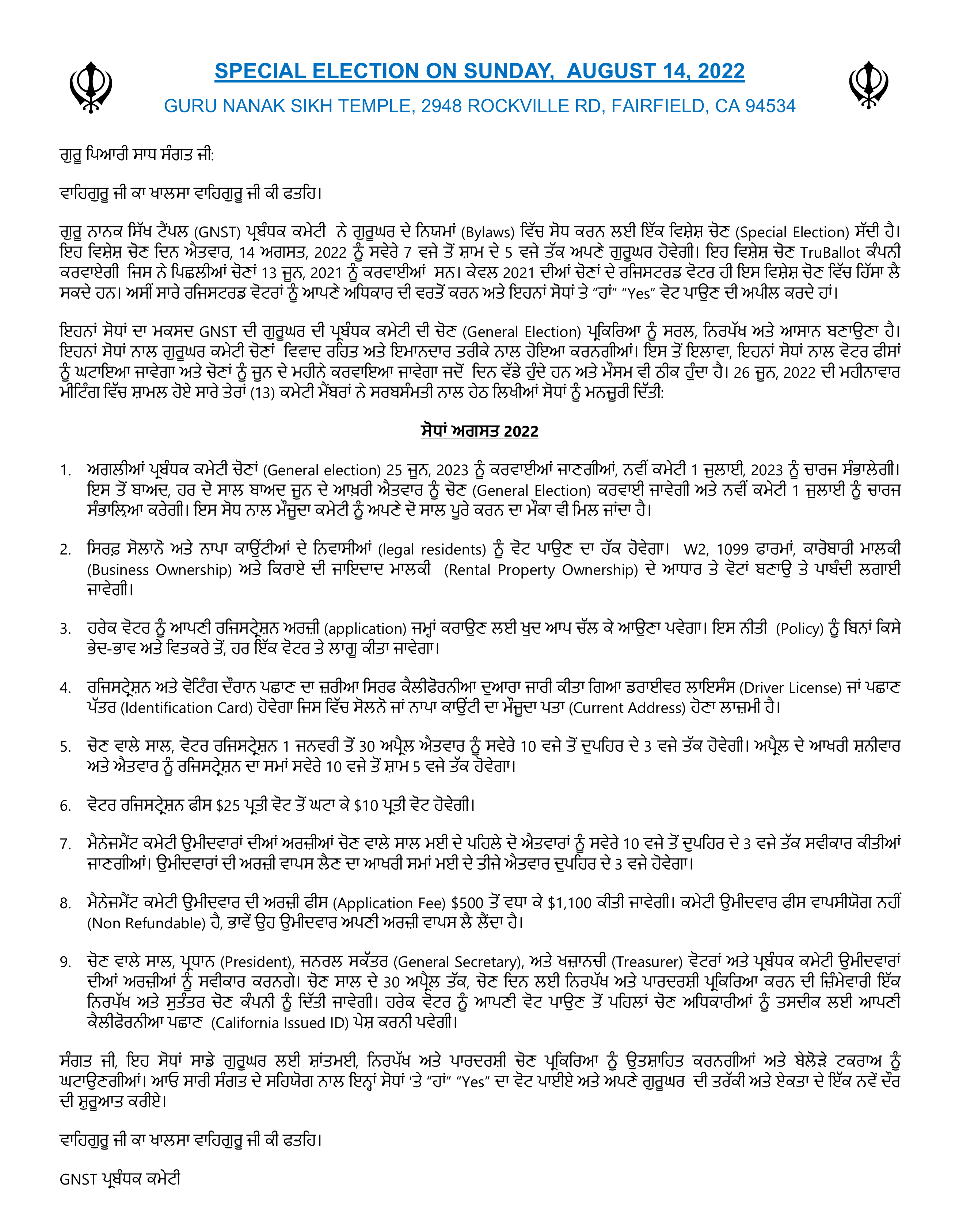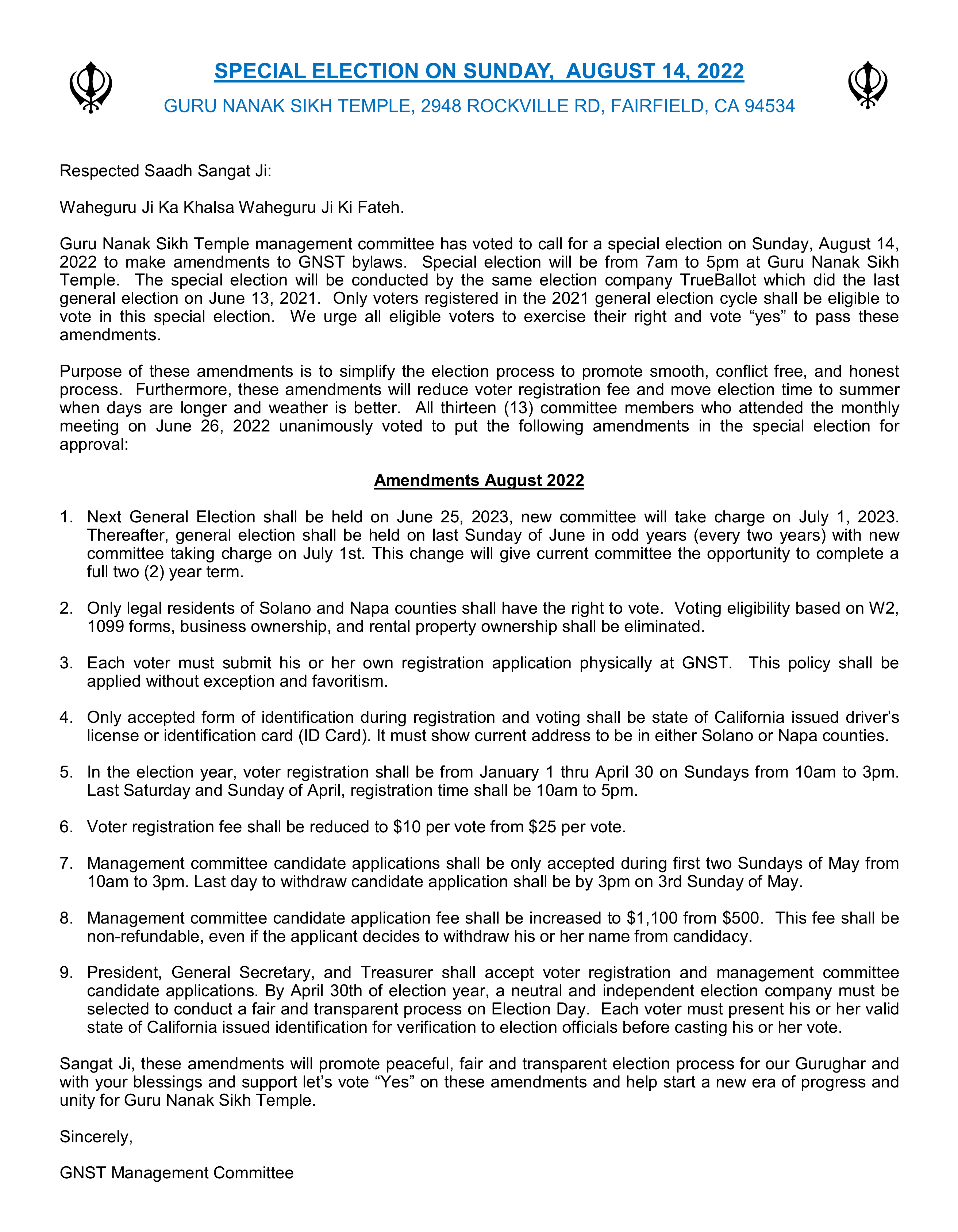 To make our Gurughar general election process simple, honest and to reduce unnecessary conflict, Guru Nanak Sikh Temple management committee has proposed amendments to bylaws in a general election to be held on Sunday, August 14, from 7am to 5pm at Guru Nanak Sikh Temple, Fairfield.